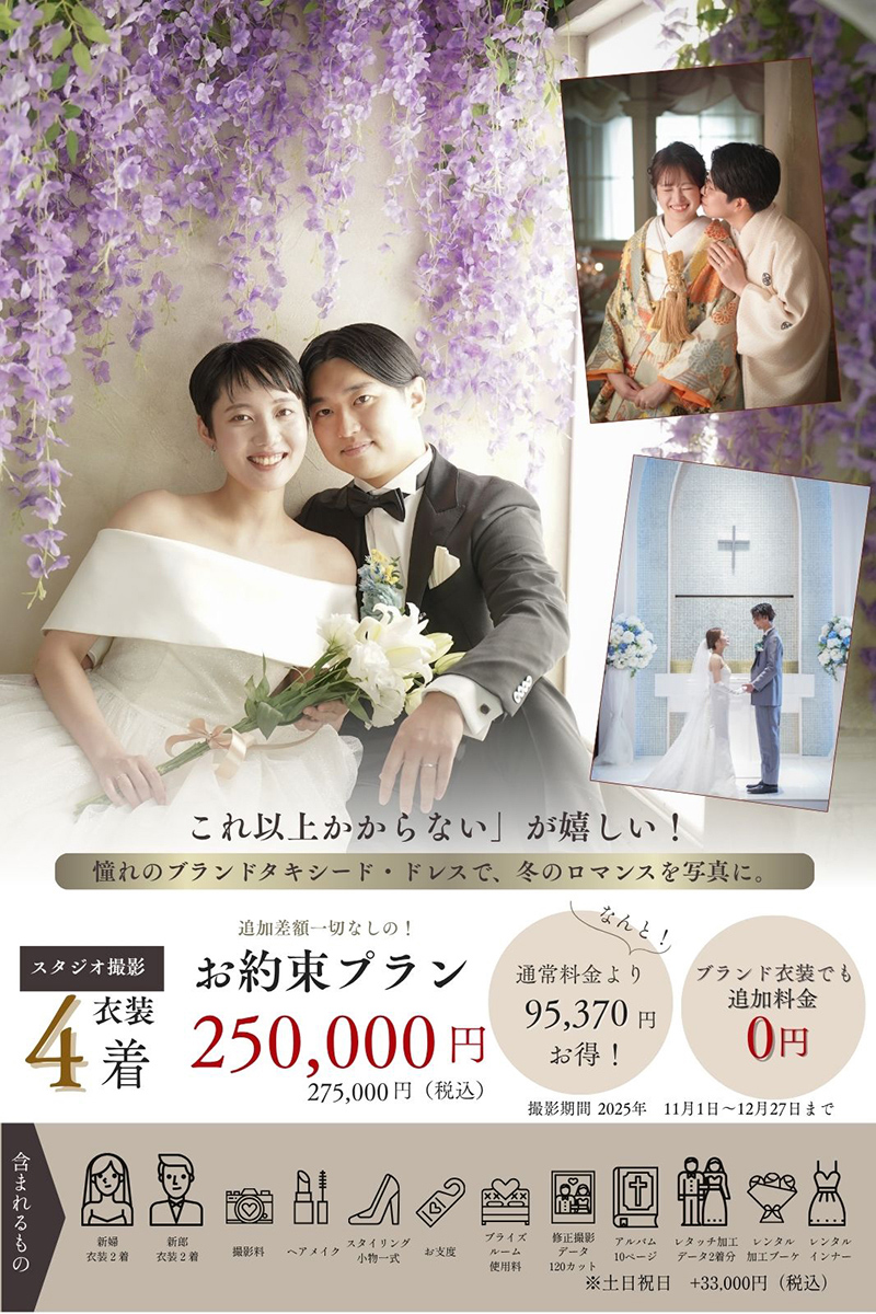 ウェディングドレス or カラードレス1着、タキシード1着、六切り写真が台紙について1枚入ったプランです。従来の型モノから「おしゃれ」「かっこいい」「イマドキ」「楽しい」とたくさんのお写真を残せます。